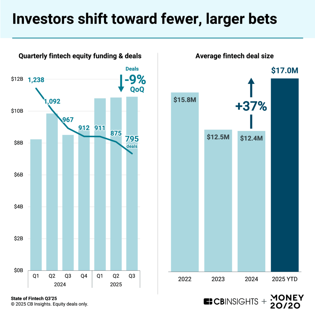 另一个明显的趋势是:对更少的公司下更大的赌注。在稳步下降之后,金融科技融资总额实际上在 25 年第一季度回升至 10.3B 美元(2023 年初以来的最高水平),这主要归功于币安一笔 20 亿美元的巨额交易。到第三季度,融资额持平于 ~$10.9B,但大型融资轮(>$100M)占其中的高达 40%。简而言之,投资者对首次公开募股感到后悔,因此他们将更多的现金投入到更少的后期交易中。事实上,中/后期融资达到了 2022 年以来的最高交易份额,而早期融资自 2020 年以来首次跌破交易的 70%。(后期交易规模中位数比 2024 年增加了 50%——所有那些处理电子表格的首席财务官都坚持明确的盈利路径。)