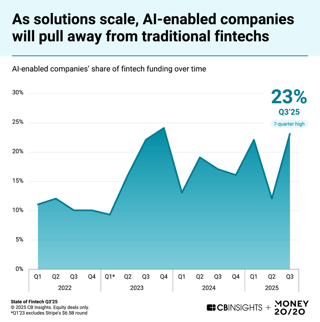 顺便说一句:炒作周期还没有结束——即使它曾经开始过。企业仍在测试和集成(正如 Manlio Carrelli 指出的那样,仅代理的成功在于 1)高质量数据和 2)供应商管理)。但记分牌很明显:在“传统金融科技”和“人工智能优先的金融科技”之间的竞争中,人工智能团队正在落后。如果您今天正在构建金融科技,那么您的成功几率可能会以某种方式涉及人工智能(只需看看:2025 年五分之一的新独角兽公司是“代理”初创公司)。