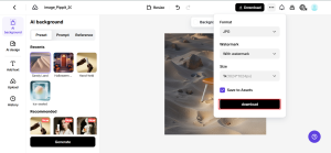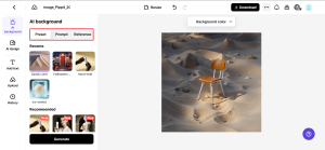 AI背景工具会自动去除背景。现在转到“预设”并选择背景,单击“参考”上传您自己的背景,或选择“提示”从 AI 创建背景。您还可以使用销售海报创建促销内容或添加文本以将标题放置在图像顶部。
