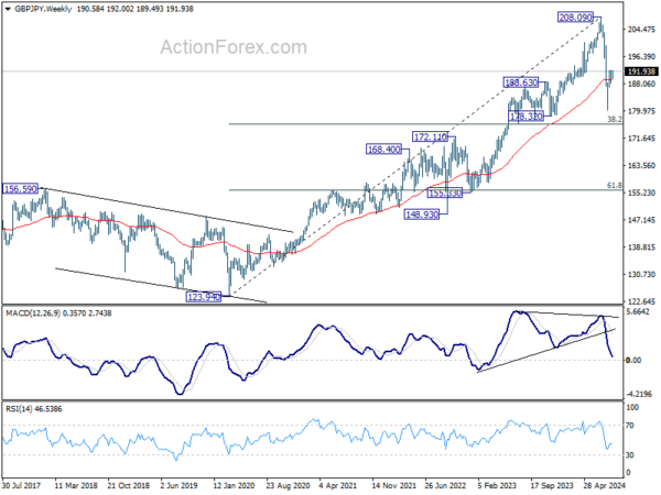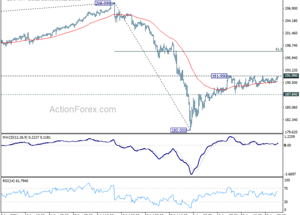 英镑/日元的前景没有变化,因为上周横盘交易继续低于 191.99。本周初步偏见首先保持中性。上行方面,突破 191.99 将瞄准 208.09 至 180.00 的 61.8% 回撤位 197.35,这是自 208.09 以来的修正模式的第二站。然而,下行方面,坚定突破 187.84 支撑位将表明从 180.00 的反弹已经完成,并将偏见转向下行,重新测试 180.00。