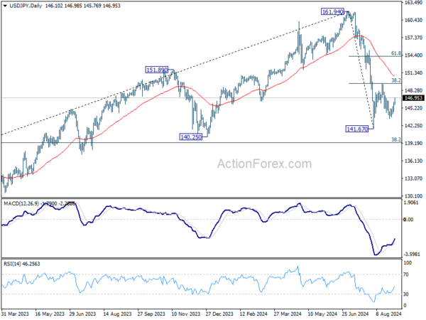 美元/日元突破 146.47 阻力位表明,自 149.35 的回调已在 143.43 完成。更重要的是,自 141.67 的反弹可能已准备就绪。盘中偏向于先上行至 149.35 阻力位。稳固突破该阻力位将瞄准 141.67 至 149.35 的 100% 投影,从 143.43 到 151.11,作为自 161.94 高点开始的修正模式的第二段。就目前而言,只要 143.43 支撑位保持不变,风险将保持上行,以防回调。