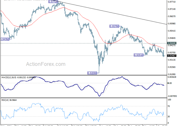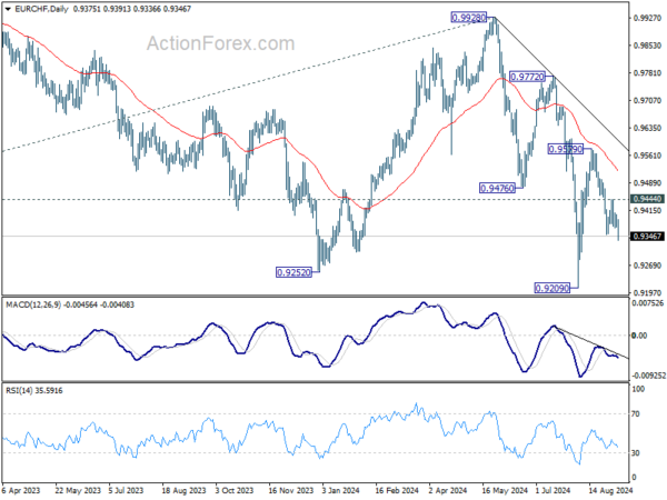 欧元/瑞郎上周从 0.9759 开始下跌,尽管中期有所回升。本周初步偏向下行。如前所述,从 0.9209 反弹应该在 0.9579 完成,领先于 55 日均线。应该看到更深的下跌,首先重新测试 0.9209。在那里的稳固突破将恢复更大的下跌趋势。目前,只要 0.9444 阻力位保持不变,风险就会继续下行,以防反弹。