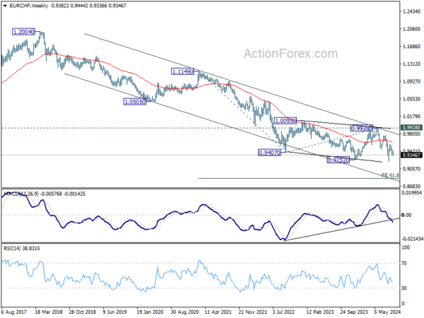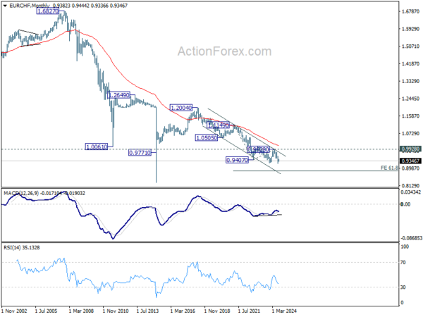 从更大角度来看,中期修正模式从 0.9407(2022 年低点)开始,可能已经完成了三波跌至 0.9928 的走势。决定性突破 0.9252(2023 年低点)将确认长期下行趋势的恢复。下一个目标将是 1.1149 的 61.8% 投影,从 0.9928 到 0.9407,在 0.8851。目前,只要 0.9928 阻力位守住,前景仍将看跌,即使在强劲反弹的情况下也是如此。
