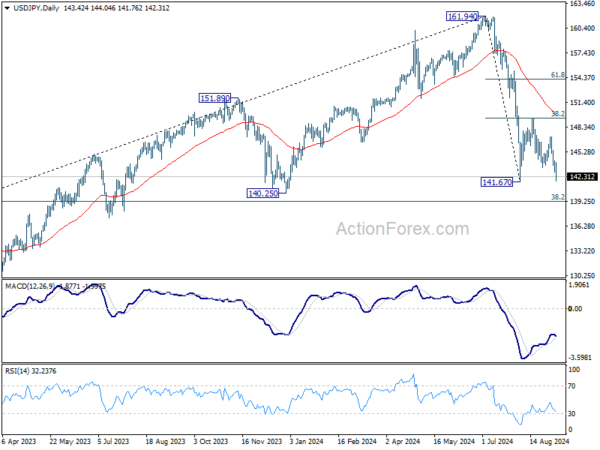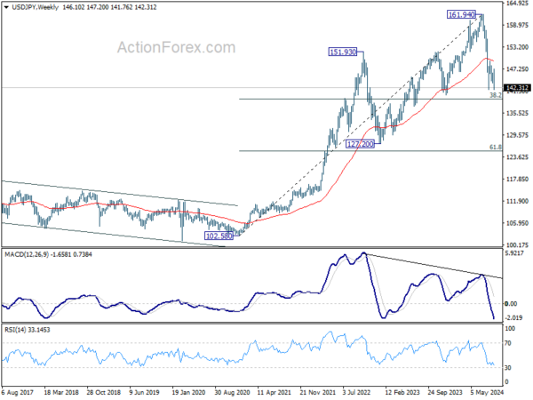 从更大角度来看,从中期高点 161.94 的下跌被视为对从 102.58(2021 年低点)开始的整个上涨趋势的修正。可能进一步下跌至 102.58 至 161.94 的 38.2% 回撤位 139.26,接近 140.25 的支撑位。无论如何,只要 55 W EMA(目前为 149.24)保持不变,风险就会继续下行。尽管如此,55 W EMA 的稳固突破将表明中期修正模式的范围已经确定。