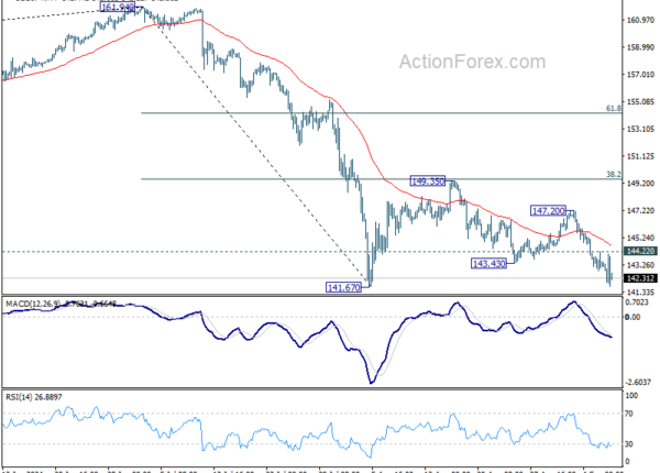 美元/日元上周从 149.35 跌势恢复,突破 143.43 暂时低点。本周初步偏向下行,支撑位为 141.67。若稳守 141.67 支撑位,则将恢复从 161.95 高点开始的跌势,下探至 140.25 支撑位。上行方面,突破 144.22 的小阻力位将首先使日内偏向中性。但只要 147.20 阻力位守住,风险仍将偏向下行,以防反弹。