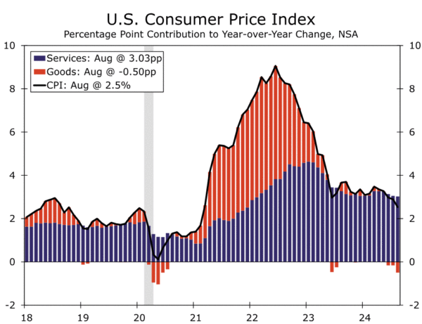 今天的 CPI 报告、上周五的就业报告以及美联储主要官员最近的沟通让我们相信,FOMC 将在下周的会议上将联邦基金利率下调 25 个基点。话虽如此,如果 FOMC 选择降息 50 个基点,我们也不会感到完全震惊。近几个月来,非农就业人数增长大幅放缓,失业率和就业不足率的上升趋势令人担忧。7 月至 8 月核心 CPI 通胀率回升对于那些希望下周降息幅度更大的人来说是个坏消息,但我们认为价格增长的潜在趋势仍然下降。