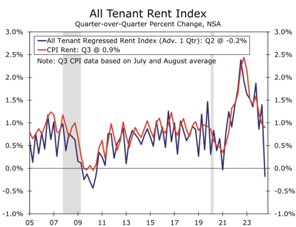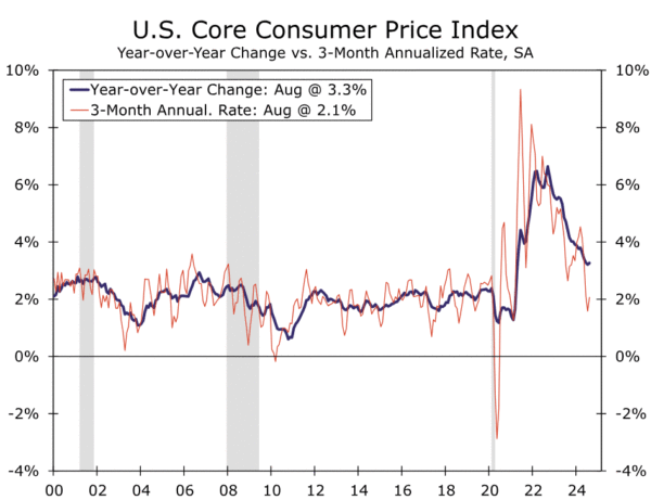 虽然 8 月份核心价格涨幅高于前三个月的平均月度涨幅(0.13%),但初夏的涨幅可能低估了通胀趋势,而第一季度的平均涨幅 0.37% 似乎夸大了通胀趋势。我们认为,8 月份的数据可能更为清晰。8 月份核心 CPI 通胀的三个月年化率仅为 2.1%,低于 3.2% 的同比涨幅。由于食品和能源相关大宗商品价格最近有所回落,劳动力市场持续降温,我们预计未来几个月通胀将保持受控。
