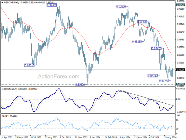 从更大角度来看,目前价格从 0.8332(2023 年低点)开始的走势被视为中期修正模式,从 0.9223 开始的下跌是第二阶段。强劲支撑位可能从 0.8332 开始反弹。然而,只要 0.9243 阻力位保持不变,整体前景将继续看跌。然而,若稳固突破 0.8332,将从 1.0146(2022 年高点)恢复更大的下跌趋势。
