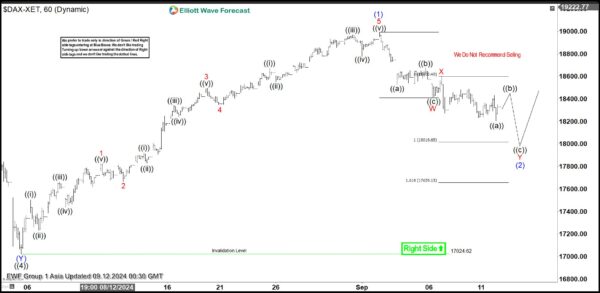 DAX 的短期艾略特波浪观点表明,该指数正在从 2024 年 5 月 8 日的低点开始,在 3、7 或 11 个波动中修正周期,然后恢复走高。2024 年 5 月 8 日回调至 17024.6,结束了波浪 ((4))。该指数在波浪 ((5)) 中走高,内部细分为艾略特波浪结构。从波浪 ((4)) 上升,波浪 ((i)) 结束于 17505.23,波浪 ((ii)) 回调结束于 17233.07。波浪 ((iii)) 上涨结束于 17666.82,波浪 ((iv)) 的回调结束于 17439.87。波浪 ((v)) 上涨结束于 18920.1,以更高程度完成了波浪 1。波浪 2 的下跌结束于 17669.64。