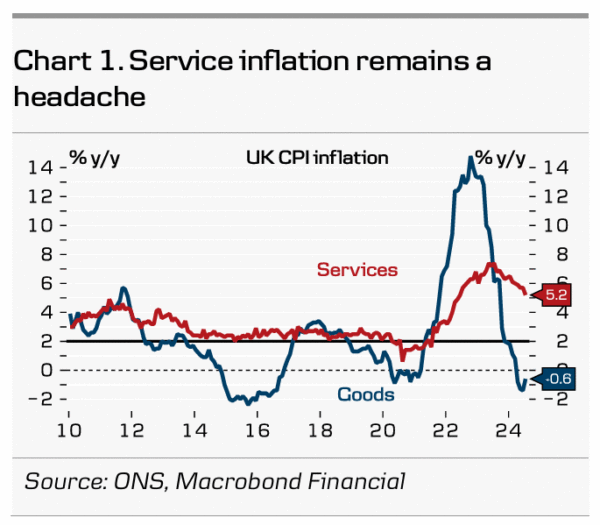 自 8 月份上次货币政策决定以来,通胀和增长数据一直低于预期,而劳动力市场数据则喜忧参半。第二季度增长略低于预期,环比增长 0.6%(英国央行预测 0.7%),初步月度 GDP 数据显示,第三季度增长将低于预期。7 月份通胀略低于预期,同比增长 2.2%(英国央行预测:2.4%),服务业是下行意外的主要原因,尽管这主要是由于酒店价格等波动性因素。请注意,8 月份通胀数据是在会议前一天发布的,可能会对我们收到的指导意见产生重要影响。