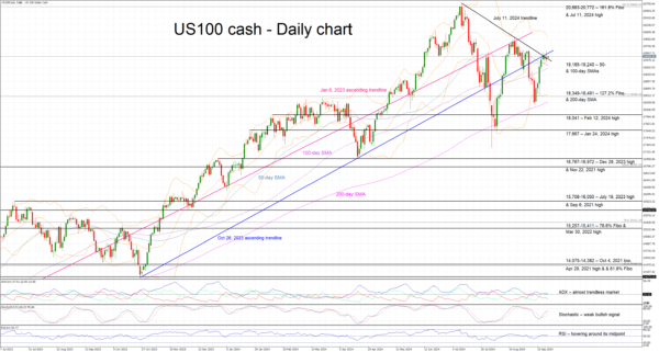 如果多头有信心, 他们可以尝试将美国 100 指数保持在 2024 年 7 月 11 日的趋势线上方,然后突破 2023 年 10 月 26 日的长期趋势线。他们的下一个目标可能是突破最近一系列较低的高点,突破 19,936 点的水平。