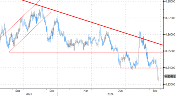 英国央行在 8 月份采取了鹰派降息。政策限制将进一步逐步放松,其速度取决于一系列数据。与欧洲央行类似的策略在货币角度上平衡了欧元/英镑。但经济形势正日益向有利于英镑的方向转变。欧元/英镑屈服于糟糕的欧洲 9 月 PMI。0.84 的支撑位被突破,2022 年低点 (0.8203) 成为关注的焦点。