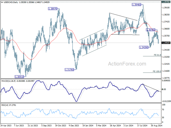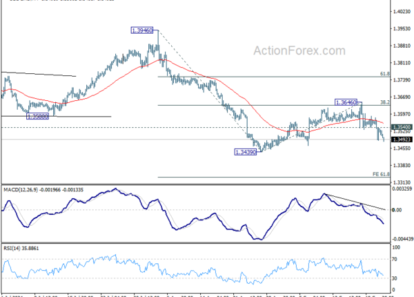美元/加元盘中偏向下行,重新测试 1.3439 低点。突破该点位将重启自 1.3946 的跌势,目标为 1.3946 至 1.3439 的 61.8% 预测值(从 1.3646 至 1.3333)。上行方面,突破 1.3540 的小阻力位将首先使盘中偏向中性。但只要 1.3646 阻力位保持不变,风险仍将偏向下行,以防反弹。