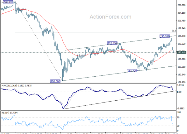英镑/日元上周小幅上涨至195.95后大幅回落,本周初步偏向中性。上行方面,突破195.95临时顶部将把修正反弹从180.00延伸至208.09至180.00的61.8%回撤位197.35。然而,若坚守190.11,则表明此次调整可能已经完成,并将偏见转回下行,寻求接下来的支撑位183.70。