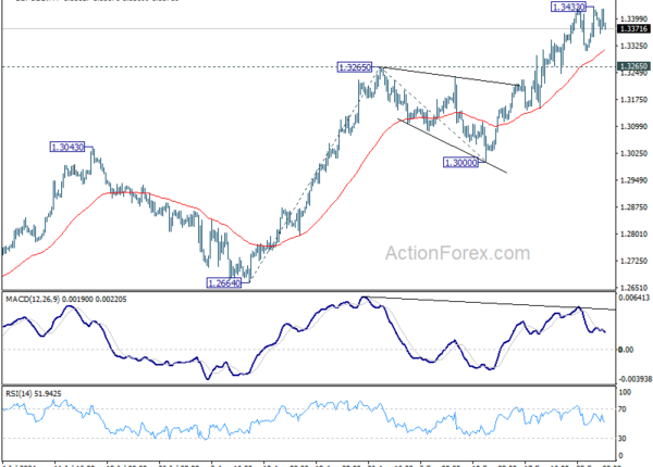 英镑/美元上周进一步上涨至1.3433,但此后开始横盘整理。本周,对于更多的盘整,最初的偏见仍然是中性的。但只要守住1.3265阻力位转为支撑位,就有望进一步反弹。突破1.3433将恢复更大的涨幅,从1.3000到1.3601,达到100%预测1.2664至1.3265。不过,考虑到4小时MACD的看跌背离状况,若能站稳1.3265,则表明短期见顶,并将转向下行,寻求1.3000支撑。