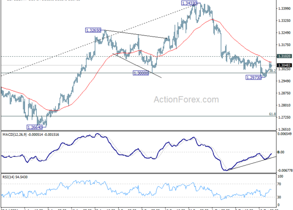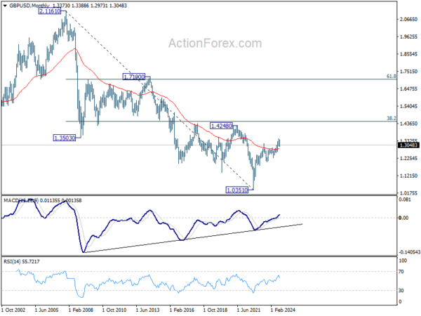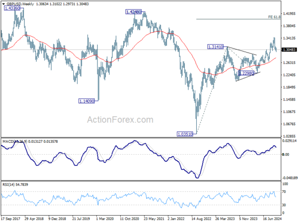 从更大的角度来看,只要守住1.3000支撑,自1.0351(2022年低点)的上涨趋势仍在进行中。下一个目标是1.0351至1.3141的61.8%预测,从1.2298至1.4022。然而,考虑到D MACD的温和看跌背离状况,果断突破1.3000将表明中期顶部已经就位,并进一步回落至1.2664支撑位。