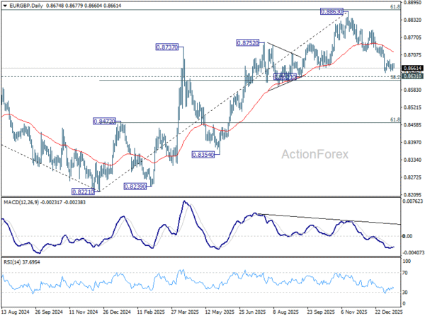从更大的角度来看,从 0.8221 中期底部(2024 年低点)上涨被视为回调。上行空间应受到0.9267至0.8221的61.8%回撤位0.8867的限制。持续低于 55 W EMA(目前为 0.8622)的交易应确认此次修正性反弹已经完成。在这种情况下,将进一步下跌至0.8201/21关键支撑区域。然而,决定性突破 0.8867 将表明欧元/英镑已经扭转了 0.9267(2022 年高点)的整体跌势。这将为回到 0.9267 铺平道路。