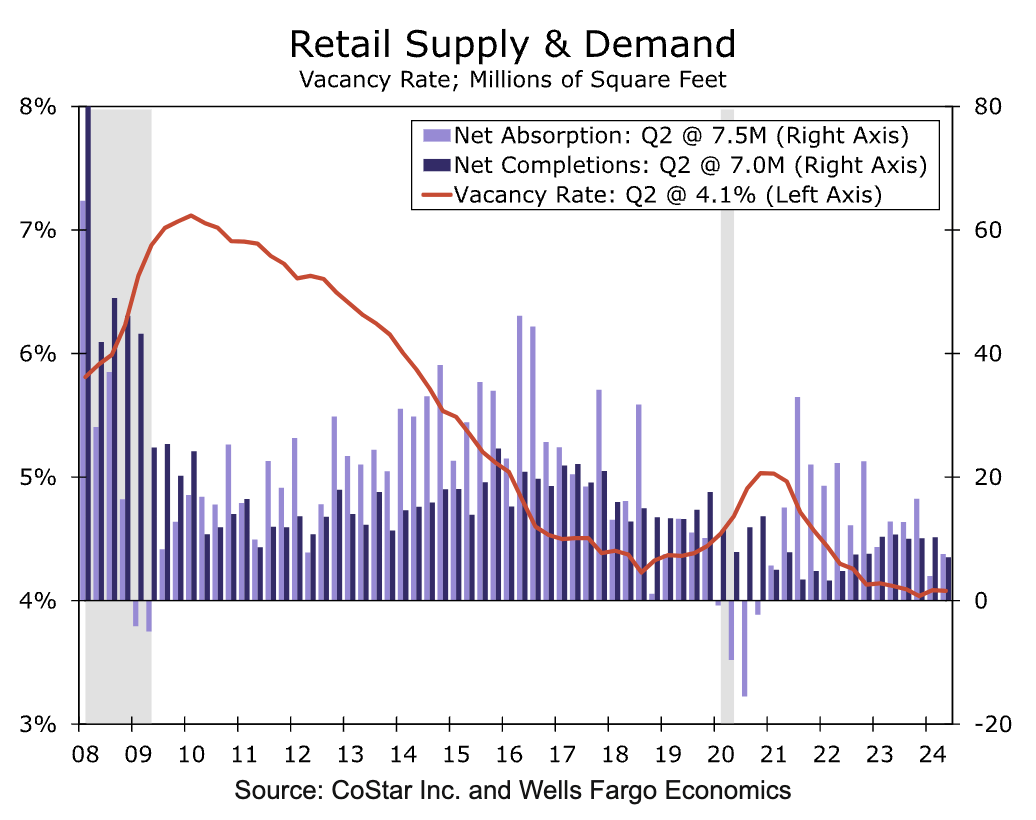 富国银行高级经济学家查尔斯·多尔蒂表示:“稳定的消费需求使零售市场保持稳健,支撑了零售空间连续 14 个季度的强劲需求。”该报告没有包括具体房地产公司的数据。