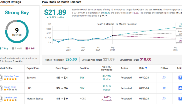根据 9 条评论,这只公用事业股获得了华尔街的强力买入共识评级,其中 7 比 2 的评级支持买入,2 比 3 的评级支持持有。该股交易价格为 19.77 美元,其平均目标价为 21.89 美元,意味着 12 个月的上涨潜力约为 11%。(见 PCG 股票预测)