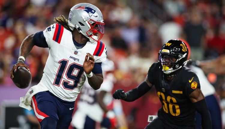 2024 年 8 月 25 日,在马里兰州兰多弗指挥官球场举行的季前赛第三节中,新英格兰爱国者队的 19 号乔·米尔顿三世 (Joe Milton III) 在华盛顿指挥官队的 36 号圭·布鲁·凯利 (Kyu Blu Kelly) 的压力下奋力拼搏。