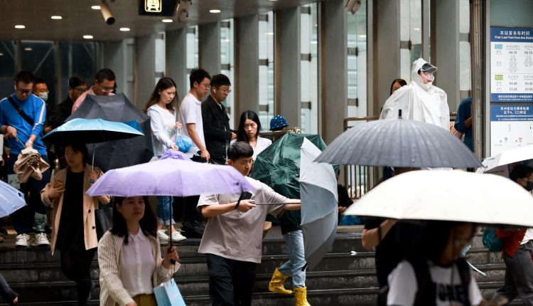 2024 年 9 月 20 日早高峰,中国北京当地居民撑着伞冒雨走出地铁站。