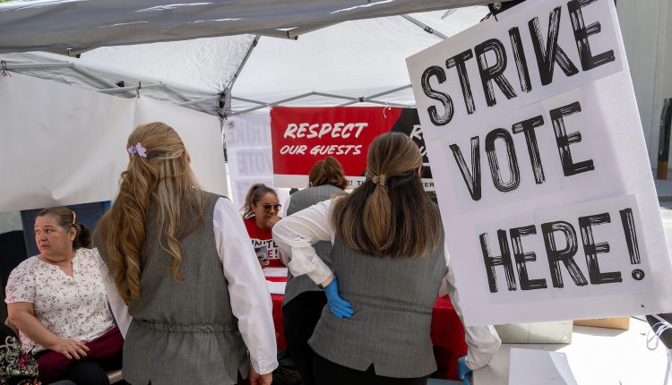 本周,工人们在萨克拉门托喜来登大酒店外举行纠察队,要求提高工资和更好的福利。今年,在新冠疫情期间的裁员之后,美国各地数千名酒店员工举行罢工,争取公平的薪酬和工作量。