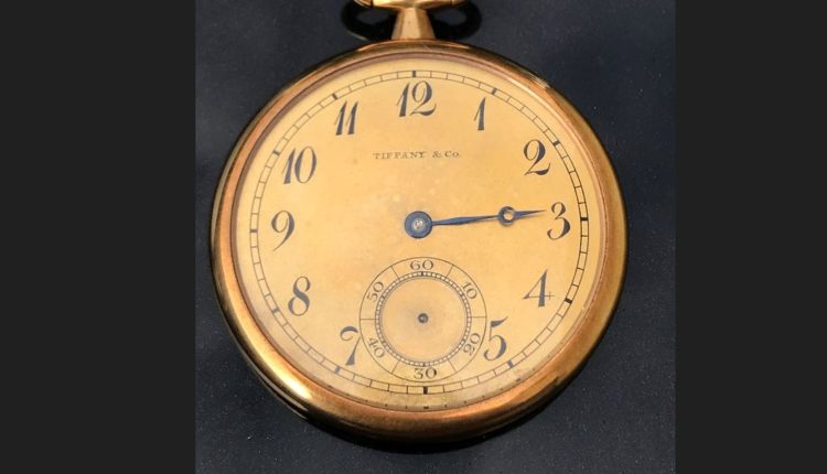 这块 18 克拉的蒂芙尼 (Tiffany & Co) 怀表是由 1912 年船沉没时去世的三位知名富商遗孀送给亚瑟·罗斯特朗 (Arthur Rostron) 船长的。
