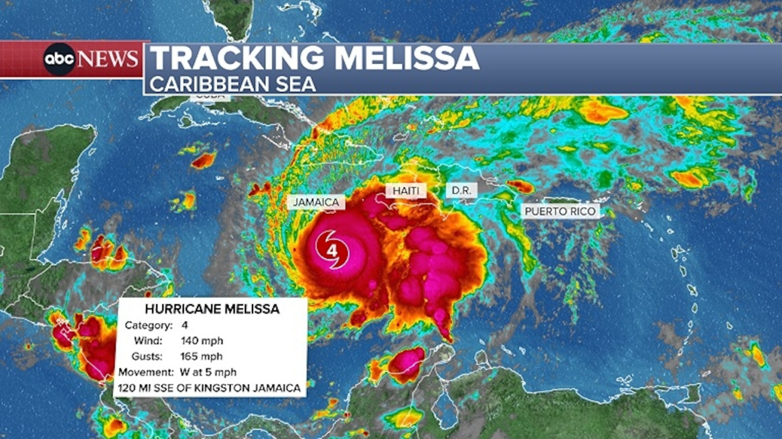 截至周日晚上,梅丽莎位于牙买加金斯敦以南约 115 英里处,以 5 英里/小时的速度向西移动,仍然是 4 级主要风暴,产生的最大持续风速为 145 英里/小时。
